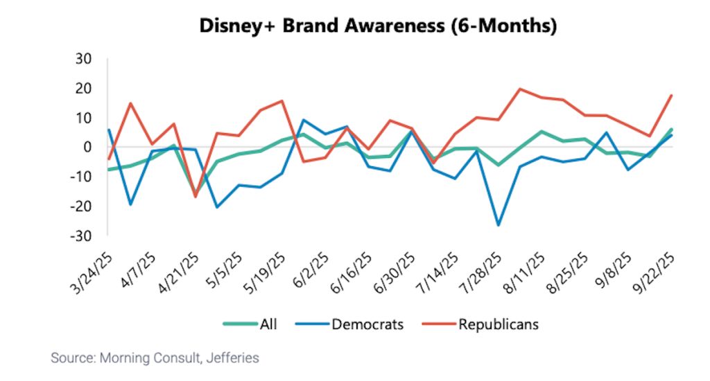 The move drew a wave of criticism and the Jefferies data highlights the continued fallout from Disney’s handling of the Kimmel situation. Democrats viewed the move as Disney capitulating to the Trump administration and an attack on free speech. Republicans slammed Kimmel’s comments as insensitive in the wake of Kirk’s murder.