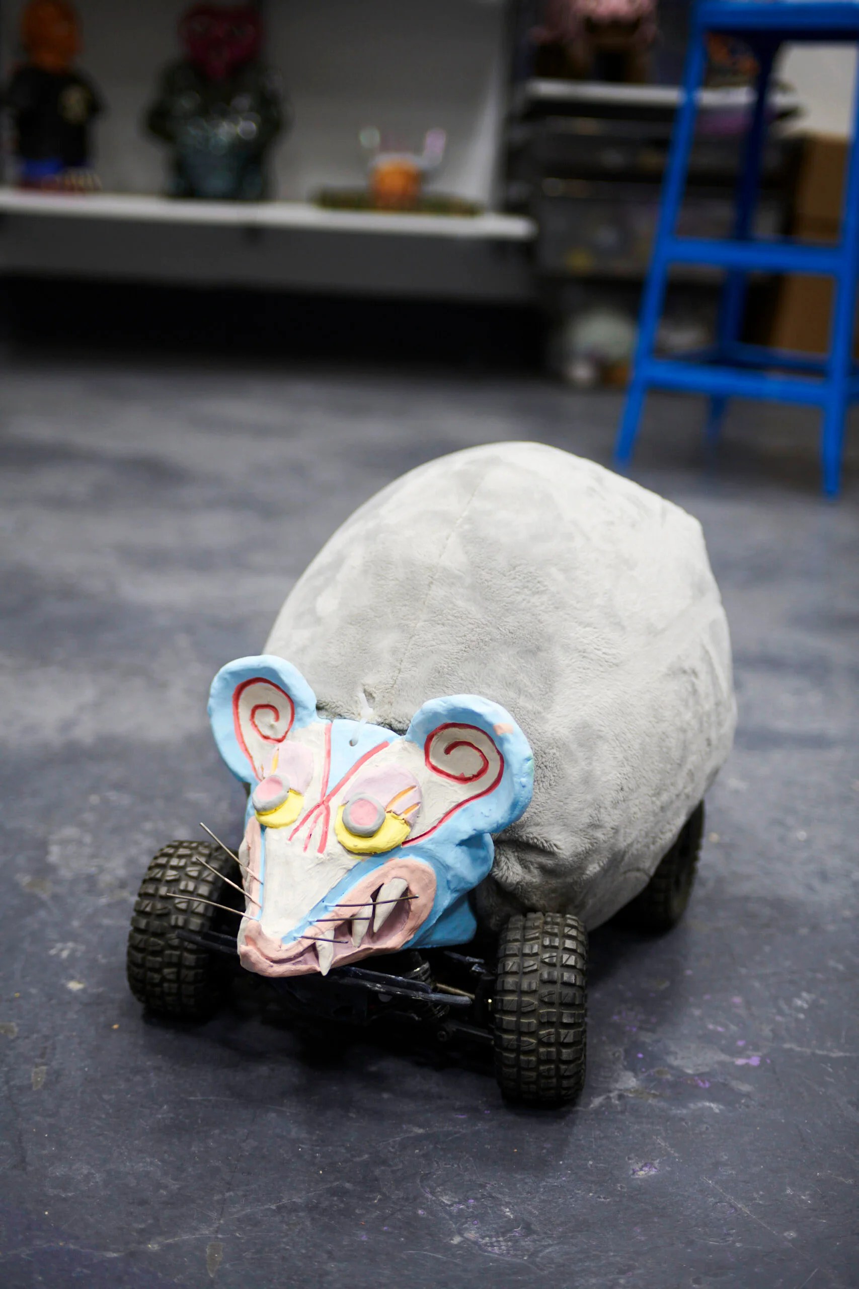 As an Angeleno, Farrag perceives the relationship with his car as more than a mere tool for transportation: Akin to a secondary home, the car is a reliable friend and a means of survival. For this project, the artist, whom we visited in his studio on the eve of the opening of the fair, has transformed radio-controlled cars into embodiments of human experience, envisioning them as a post-human representation that reflects our societal shift toward unity with technology. Comprised of sculpted terracotta rats fitted atop the chassis of RC cars, Farrag’s Rat Race serves as an allegory for competition and capitalism, symbolizing the relentless pursuit of work, money and survival. During the hours of the Fair, he is inviting VIPs and a group of lucky visitors to join the rat race by experiencing his moving sculptures and race against each other on the airport’s athletic field, with awards for the winners.