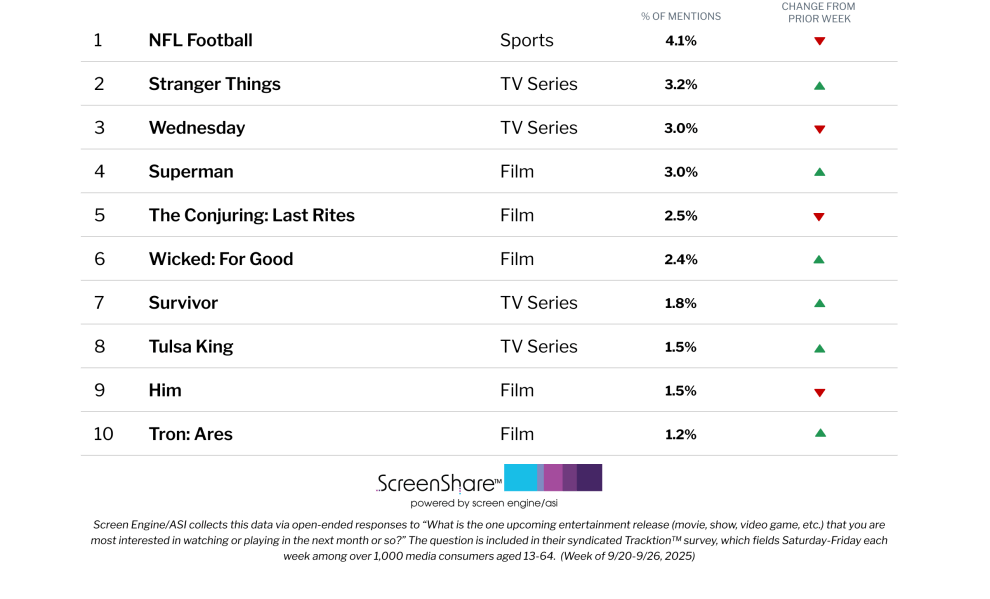 NFL Football maintains the top spot for another week. “Stranger Things” climbed one spot to No. 2, pushing the previous No. 2, “Wednesday,” down to No. 3. “Superman” made a strong surge, gaining two spots to land at No. 4, now that it is available to stream on HBO Max. Meanwhile, “The Conjuring: Last Rites” slipped one spot to No. 5.