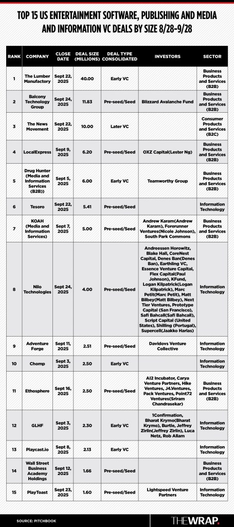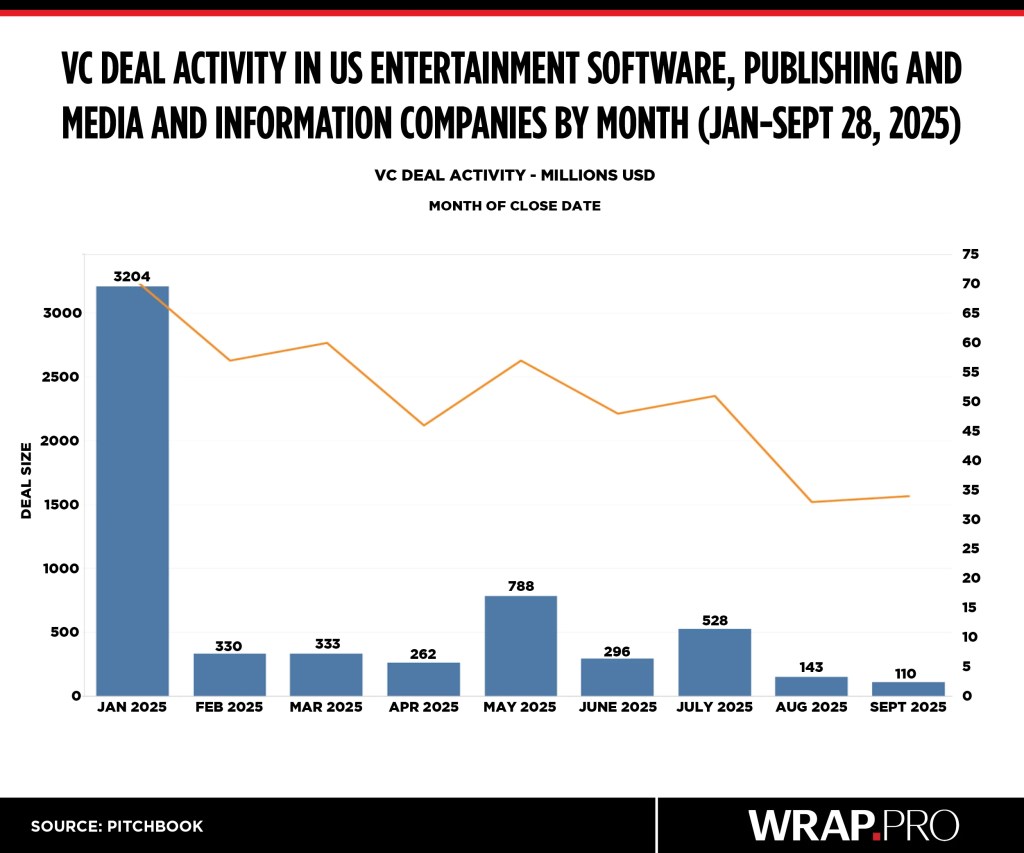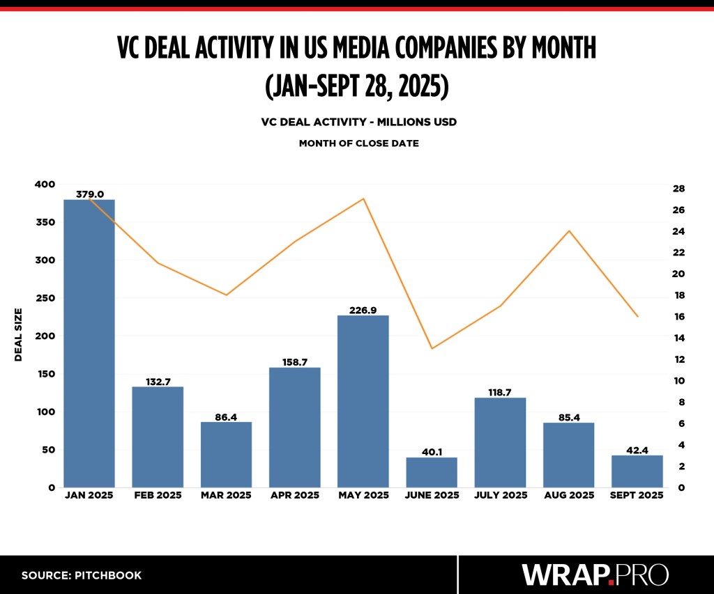 September saw venture capital raises in media and entertainment startups and young companies hit more than $152 million through 51 deals, showing a slowing pace from previous months, according to new PitchBook data. August counted $236 million in raises through 57 deals, according to PitchBook’s revised data.