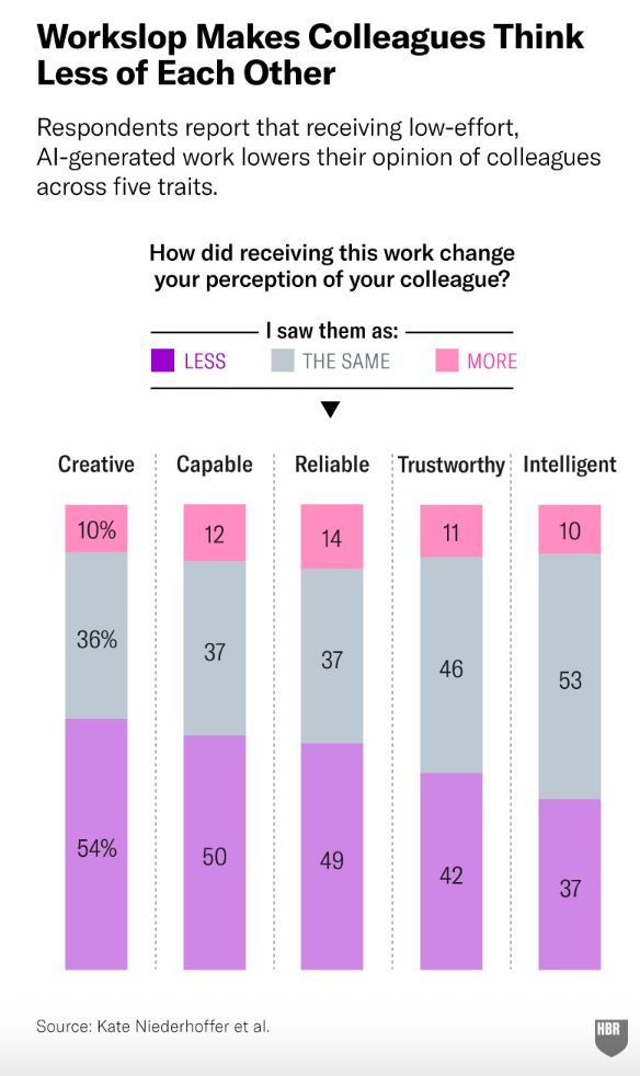 2. AI Slop We’ve read so much about the benefits of AI-assisted work efficiencies, how the technology will improve not only the quality of work but the time spent working. That is why a study cited by The Harvard Business Review last week was striking to us. “In collaboration with Stanford Social Media Lab, our research team at BetterUp Labs has identified one possible reason: Employees are using AI tools to create low-effort, passable looking work that ends up creating more work for their coworkers. On social media, which is increasingly clogged with low-quality AI-generated posts, this content is often referred to as ‘AI slop’.” At work, it’s been referred to as workslop and it’s even being turned into a verb as in “you were workslopped.”