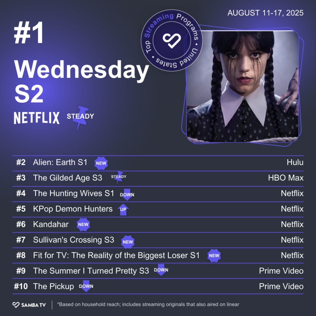 Two of Netflix’s biggest hits ever – “Wednesday” and “KPop Demon Hunters” – focus on strong female characters confronting the occult and fighting off evil spirits. Both programs make the chart again this week and, perhaps through their combined powers, help fend off an invasion that had the potential to end Netflix Summer on the Samba TV Wrap report Top 10.