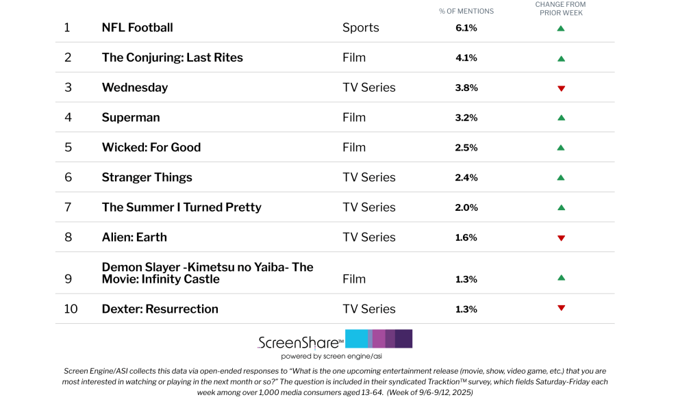 NFL football holds strong at No. 1, riding the momentum of the season’s opening games. “The Conjuring: Last Rites” moves up to No. 2, capitalizing on its theatrical debut Sept. 5, while “Wednesday” slides down one spot to No. 3 following the release of the second half of its second season on Netflix. “Superman” drops out of the top three to No. 4, and “Wicked: For Good” also falls one position to No. 5, despite continued anticipation for its upcoming release.