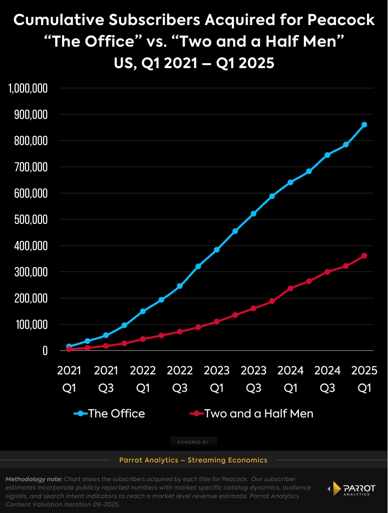 A fairer comparison is looking at how “The Office” has performed for Peacock compared to its old linear rival, “Two and a Half Men.” For Peacock, “The Office” has been the clear winner. Since its arrival on the platform in 2021, we calculate that “The Office” has acquired nearly 900,000 subscribers for Peacock, which is more than double the amount brought in by “Two and a Half Men.”
