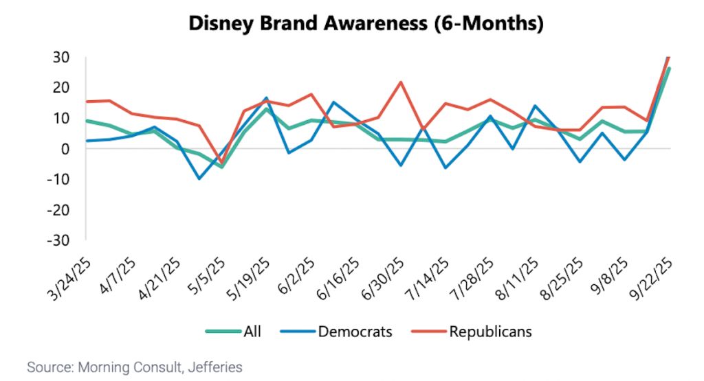 The move drew a wave of criticism and the Jefferies data highlights the continued fallout from Disney’s handling of the Kimmel situation. Democrats viewed the move as Disney capitulating to the Trump administration and an attack on free speech. Republicans slammed Kimmel’s comments as insensitive in the wake of Kirk’s murder.
