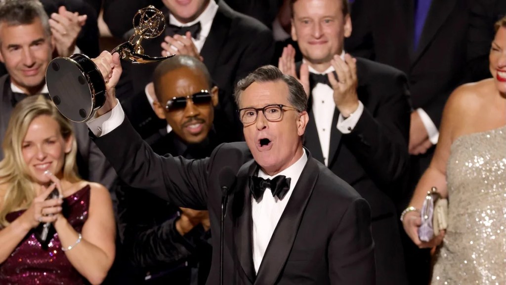 Later in the show, “The Late Show” won the Emmy for Talk Series, and the award show audience erupted. Colbert gave a powerful speech about love and loss that capped with “I’ve never loved my country so desperately.”