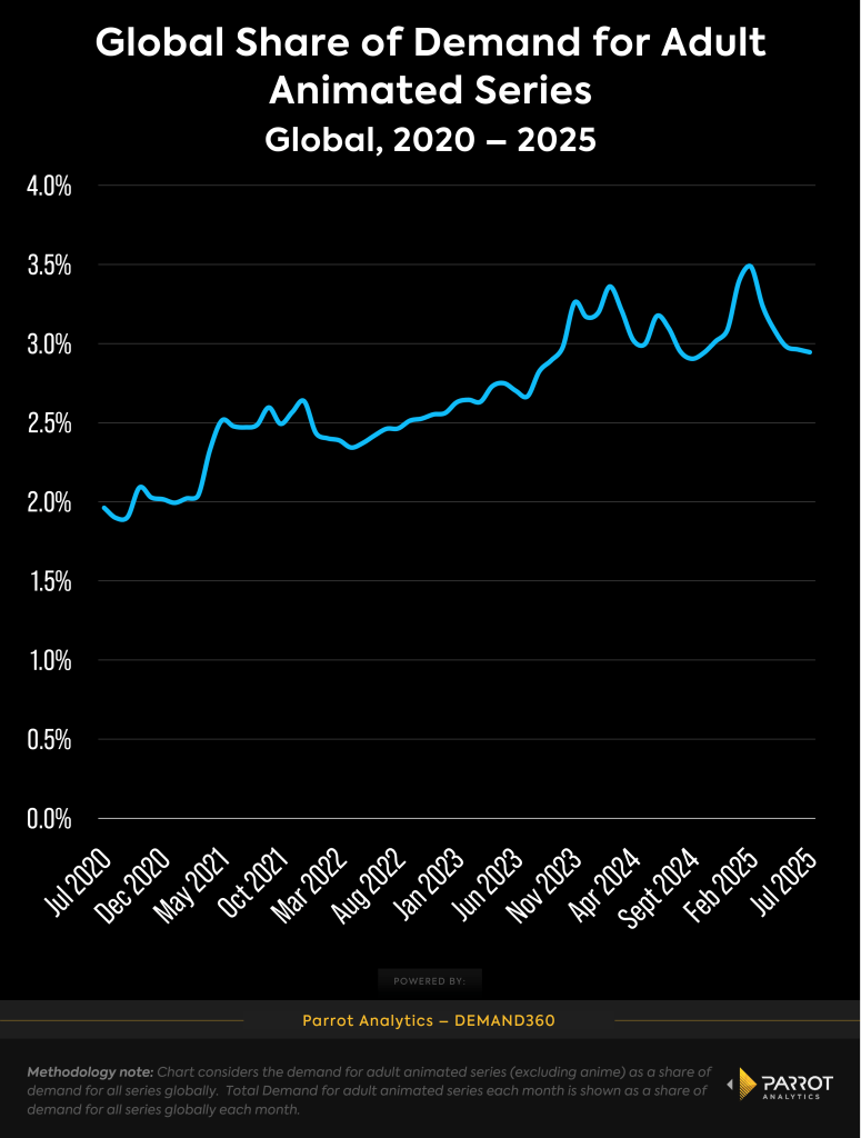 The backdrop of this heated negotiation over a particularly valuable piece of IP is a growing market for adult animation. In 2020, adult animated shows (excluding anime) accounted for about 2% of global demand for all series. This has consistently grown over the past 5 years, peaking this year at a 3.5% share. It might seem like a modest uptick in growth when we are talking about single-digit percentage points, but going from 2% to 3% means that the share of global audience attention this genre accounts for is 50% larger today than it was in mid-2020.