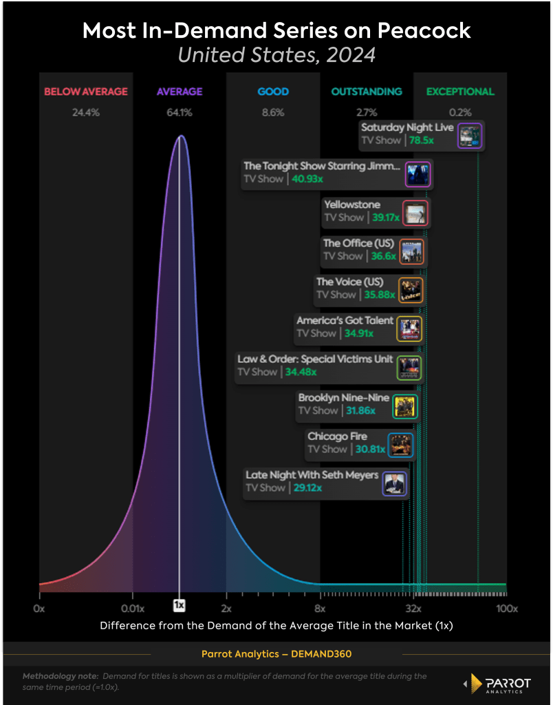 Even today, “The Office” remains in Peacock’s top 10 most in-demand shows, years after it aired its final episode. The only Peacock original in the top 10 on the platform was “Love Island USA.” We estimate that this has earned just over $40M in streaming revenue for the platform compared to “The Office” which has brought in over $100M in subscriber revenue for Peacock.